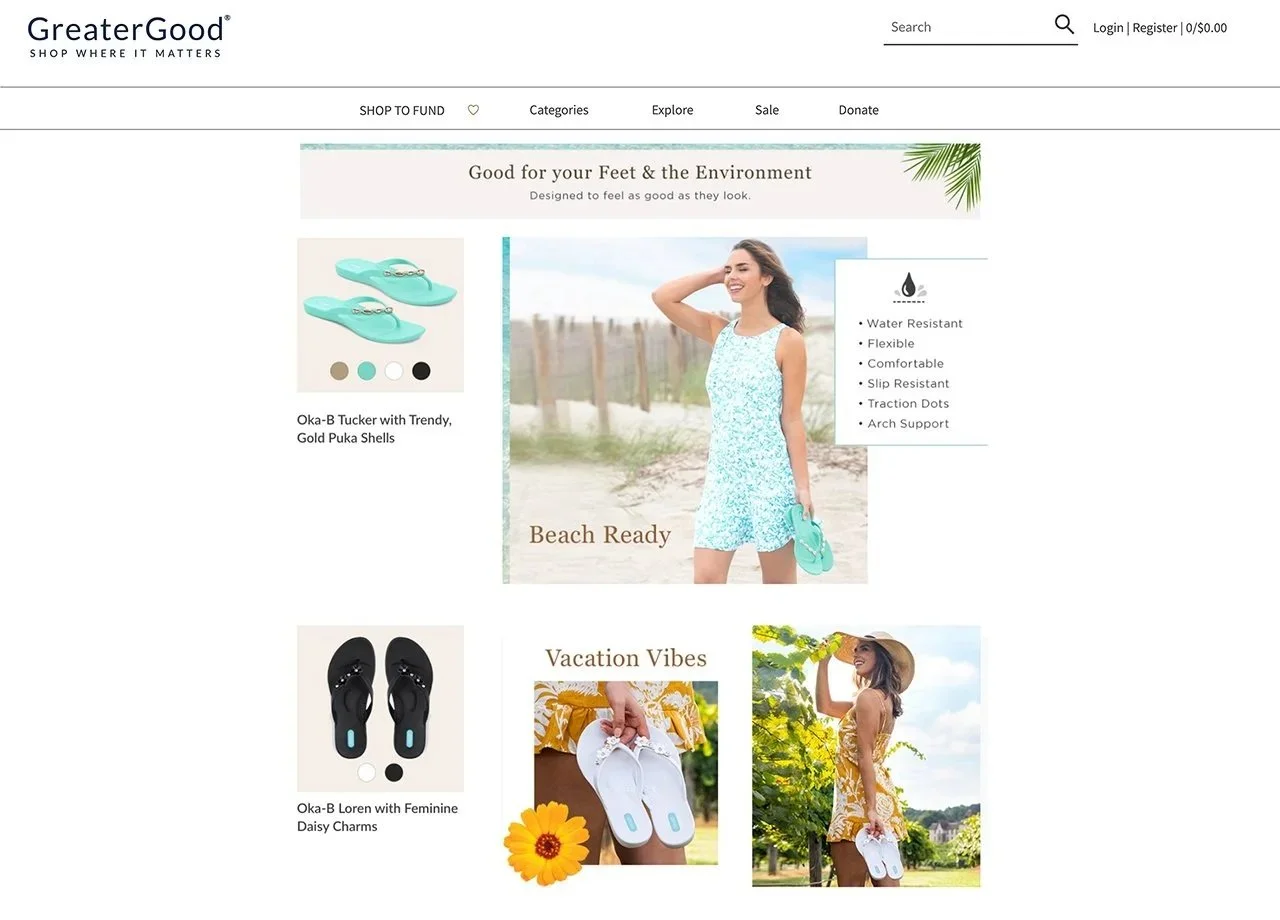 This customer education piece showcased Oka-B footwear. The landing page teaches customers the benefits to buying this product, they can support women in business as well and the environment by purchasing these shoes. Of course, with every order, you will also donate to the charity of your choice.