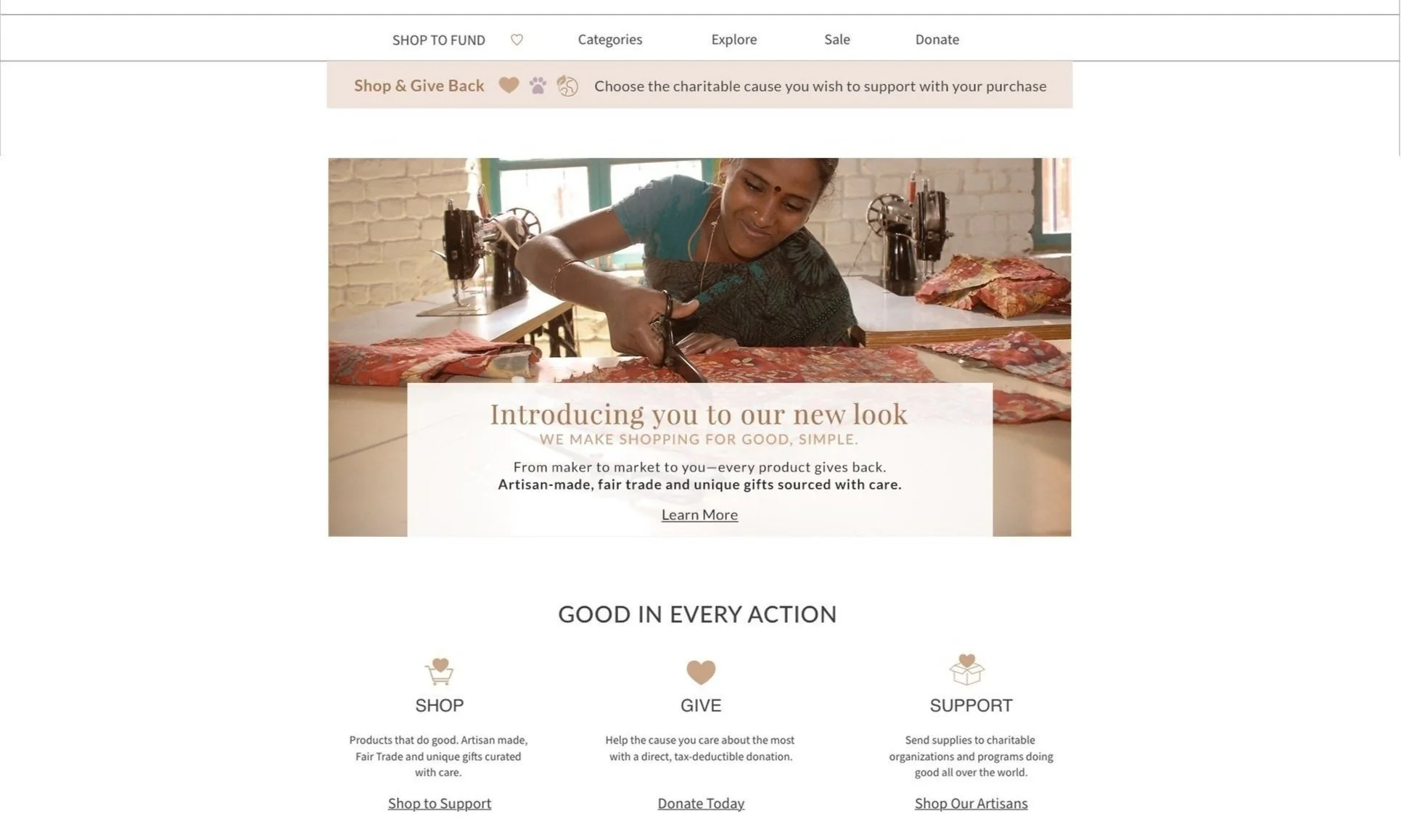 This project was a company rebrand which was aimed to showcase our fair trade products more and push our customer to make more higher-priced purchases. Our company was experimenting with more customer education pieces to sell more eco-friendly, vegan and handmade products. A big goal was to attract a younger audience.